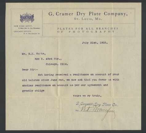 Business letter (II) of 5 August 1897 written by the company BENJ. FRENCH & CO., in Boston (Massachusetts, USA), dealers in photographic goods of every description, sole American Agents for the celebrated Voigtländer Euryscopes and Darlot lenses.