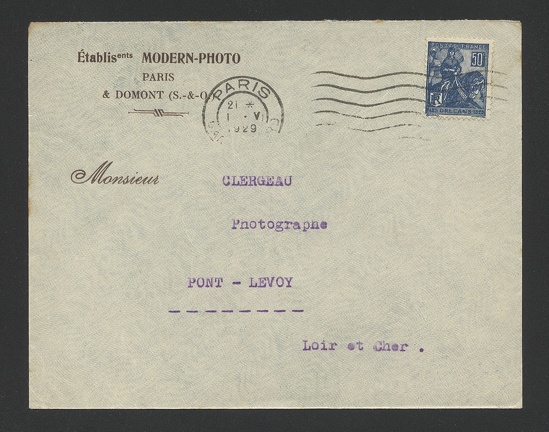 Business stationery (cover) used by the company M. BAUCHET & Cie. in Rueil Malmaison (France), offering photographic plates, papers and films. The letter (invoice) was addressed to Monsieur L. Clergeau (1877 – 1964), clock-maker and photographer in Pont-Levoy (aka Pontlevoy, France). During the years 1902 – 1936 he, later accompanied by his daughter Marcelle (1903 – 1984), took over ten thousand photographs picturing daily life of people living in the village Pontlevoy and in other places. He is considered pioneer of French sociological photography and his photographs were published in form of postcards and also in a book “A village in France”.