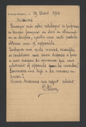 Business stationery (postcard, front of) used by L. PILEUR of Acacias (Switzerland), who wrote to the New York company “The Photograph Machine Co.” asking for a catalog of photographic equipment.